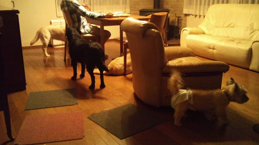 三匹の猛獣とチョビタ(仮称 被災犬が我が家に・・・ うちの娘にヘコヘコするから、スリッパでおもっきり叩いてやった。 多分、彼の人生で一番の衝撃だったっぽい(笑