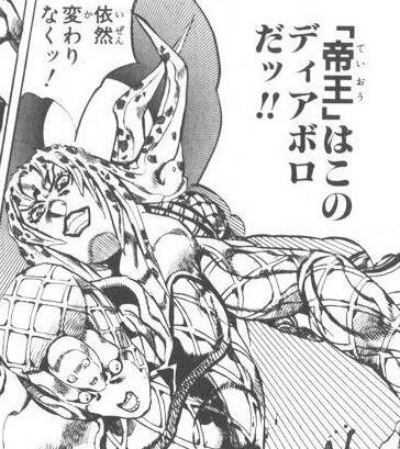 【「帝王」はこのディアボロだッ!!依然変わりなくッ! ポーズ ジョジョ立ち】
