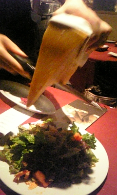 友達の結婚披露パーティでも使われましたっ!! 天王寺の駅から徒歩2分ほどっ!! フレンチ・イタリアンのお店っ!! 周辺には店はなぁ~んもありませんっ!! では、早速中に入ってみましょうっ!! 中に入ると出迎えてくれるのが、この急な階段っ!! 大人の階段登ってる気がしましたっ(;゚Д゚)シテネーヨ もともと駐輪所なんですよっ!! かつては、自転車を押して上がってたんですねっ!! 店に入ると、こんな感じっ!! 今日はたまたま誰かの誕生日だったらしくっ!! 店全体で祝ってやってましたっ!! 注文した料理はこちらっ!! サラミや生ハムの三種盛り、サラミ ミストっ!! 生ハム超好きっすっ!! 生ハムメロンは許せないっすっ(つд⊂)エーン 生ハムでも色々あるんですなっ!! 続いてモノクローム サラダっ!! ガラガラッと出てきたのは、大袈裟な装置っ!! サラダを目の前でつくってくれるんですってっ!! 手前にあるのは塩と胡椒と、なんとかソース的なものっ!! 左奥にあるチーズをっ!! 好きなだけ削ってくれるようでっ!! ダンマリを決め込もう思いましたが、良い塩梅でストップっ!! チーズ好きなんで、多目に頂きましたっ!! 続いて注文したのは、マルゲリータっ!! 別に写真撮るの忘れて、食べたわけじゃないんだからねっ!! 臨場感を出そうとしただけなんだからねっ(笑) このほうが美味しそうに見えると思ってやったんだからねっ!! わざとだからねっ(笑) (´Д`)ハァ… トマト嫌い(つд⊂)エーン 続いて、リングイネ ポルチーニ風味のカルボナーラっ!! ポルチーニって何? 【ポルチーニ】 ポルチーニ(イタリア語: porcino(複数形:porcini)、英語: porcini)はハラタケ目イグチ科ヤマドリタケ属の食用キノコ。フランス語ではセップ(Cèpe)。香りが良く、イタリア料理など、ヨーロッパでよく使われるほか、中国の雲南料理でも珍重される。単一の種を指すのではなく、ヤマドリタケ(Boletus edulis)とそれに類似の近縁種の総称である。ヤマドリタケモドキ(Boletus aestivalis (=B. reticulatus))も含む。(ウィキペディアより) 説明、全然、美味そうじゃないっ(笑) まぁ、そんなキノコみたいっす(つд⊂)エーン 今回は会社の可愛いお姉様とお洒落でムーディな夜を過ごす予定でしたがっ!! 同期のビチクソ君が不服にも付いて来てしまいました(´Д`)ハァ… このぉ・・・ このビチクソがぁ~っ by.マライア(バステト神) 怒りでプルピク プルピクしてしまいましたよっ(;゚Д゚) あと、「やれやれだぜ」写真を撮ってくれたのが、このビチクソ君ですが、 もっと良い「やれやれだぜ」を撮ってほしかったです(笑) 足が入ってないのがスゴク不満ですっ(;゚Д゚) ウソウソ、感謝してます(´Д`)ハァ…(笑) 『monochrome(モノクローム)』 HP:http://www.monochrome913.com/ 住所:大阪市天王寺区悲田院町10-39 Mio駐車場ビル2F 電話:06-6770-1366