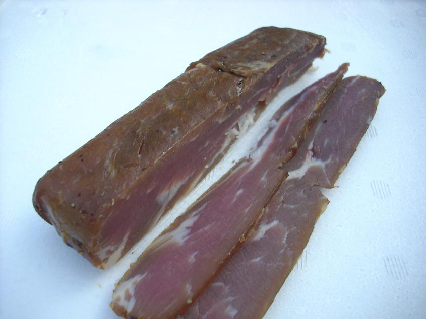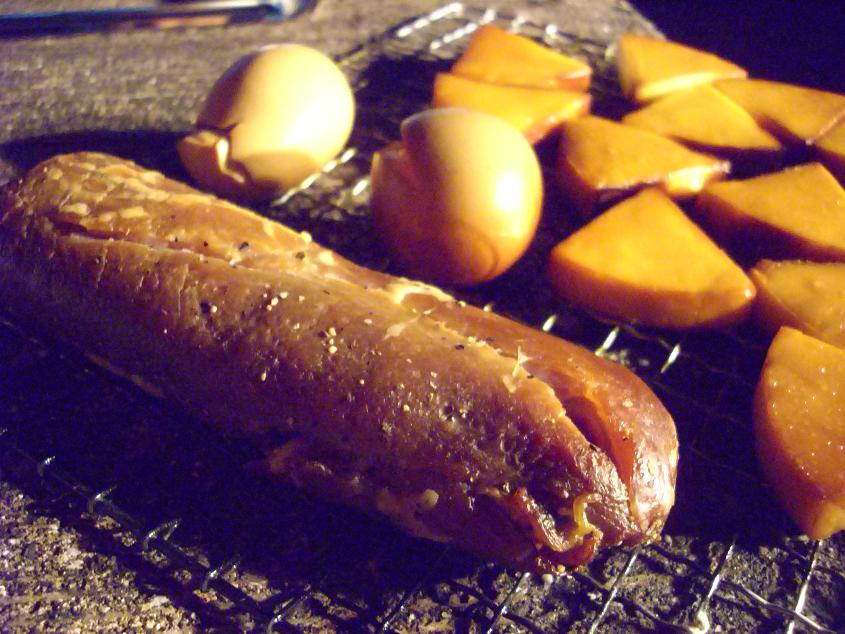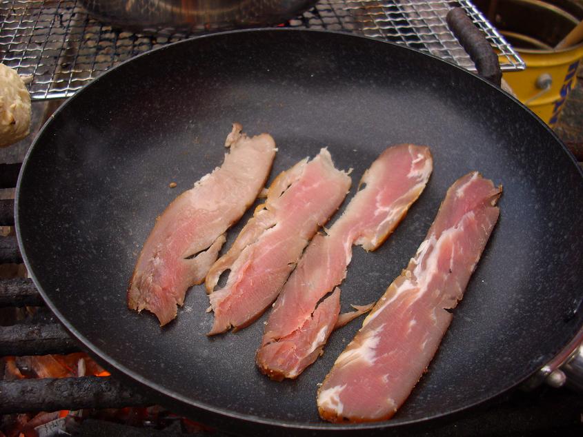 今回の滋賀キャンプのために作った、自家製ベーコンをご紹介っ!! まずは、麦豚君っ!! なるべく脂身の少ないものを選びますっ!! ナイフとフォークで肉に切れ込みを入れ、適量の塩をすりこみますっ!! 中から水分が出てくるのがスグにわかりますっ!! 味付けもそうですが、水分を取るために塩が一役買うわけですなっ(;゚Д゚) 塩の後は、ブラックペッパーとバジル的な奴でっ!! どうです? なんかそれっぽいでしょ?(笑) あとはローリエを入れて、冷蔵庫で3~4日密閉っ!! この時点で相当なワクワク(笑) 一日に一度はひっくりかえしたりしなくちゃならないようでっ!! 冷蔵庫の前を通る度に、空けては(・∀・)ニヤニヤ、空けては(・∀・)ニヤニヤ(笑) 3~4日経って取り出すと、もうビチャビチャ!! これを水に入れ塩抜きっ!! この塩抜きがベーコン作りの重要なファクターのようですっ!! 塩加減がこの時に決まるわけですなっ(;゚Д゚) 塩抜きだけで、丸1日かけますっ!! それをまた乾燥させなきゃならないようでっ!! そのまま冷蔵庫へ投入っ!! 表面の水気がなくなるまで、ほっときましたっ!! この時点でこの自家製ベーコンに対する愛情はマックス(笑) まるで我が子を抱きかかえるように冷蔵庫へっ!! 2日程度ほっとくと、表面は乾燥しており、なんとなく良い感じっ!! キャンプ場に到着し、早速ダンボールで作った燻製ボックスにっ!! 今回燻製するのは、 普通の6Pチーズと、自家製煮卵と、我らがベーコンっ!! この時の(・∀・)ニヤニヤもたまりませんでしたっ!! スモークチップに火を付け、待つこと4時間っ!! スッゲ!! ウマソーっ!! ヤヴァくない? チーズはこんなに良い色にっ!! 彼はホットワインで頂きましたっ!! また、このホットワインと合う合うっ!! 至福のひと時っ!! ベーコンはどうしたかって? 『見てくださいっ!この格好良いボディ!!(ジャパネット風)』 焼ける音がたまらんっ!! たまらんたまらんっ!! 超うまそうじゃないっすか? こちらもまた自家製のパンで頂きましたっ!! 少し塩辛いベーコンでしたが、大成功っ!! 皆さんも是非、お試しくださいっ(;゚Д゚) 今回は「やれやれだぜ」がないということで、サービスしちゃいますっ!! 「やれやれだぜ」じゃないジョジョ立ちっ!! 『ジョジョの奇妙な冒険』第4巻よりっ!! ギャァァァァースッ(笑) 今回は特別サービスということでっ!! いやぁ、楽しかったっ!! ~ベーコン作りまとめ~ ①豚バラブロックに塩適当(いや、相当多め)、黒胡椒適当、バジル適当 !! ②ローリエとともにジップロックで冷蔵庫にて3日程度密封っ!! ③水で1日放置っ!!たまぁに水かえますっ!! ④塩抜きした肉をキッチンペーパで水気を取り、冷蔵庫で2日乾燥っ!! ⑤乾燥させた肉をチップで燻製っ!! 以上っ!!