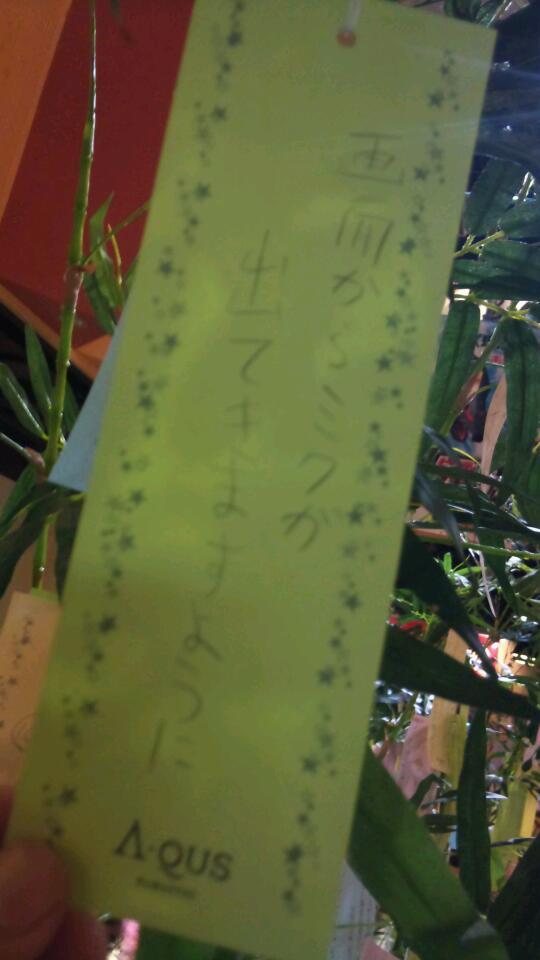 七夕の用意がしてあり、短冊にはいっぱい願い事が書いてありましたっ!!『テストで100点が取れますよーに』カーワーイイ(^o^)『ちょうちょになれますように』これもカーワーイイ(^o^)どれもチビッコの可愛さが出てますたっ!!ひとつを除いて…『画面からミクが出てきますよーに』…
