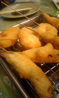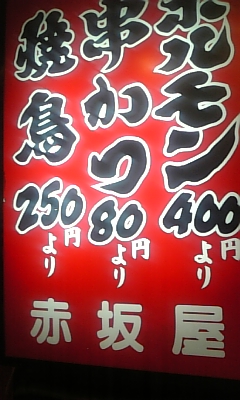 今回は特別版「やれやれだぜ」っ!! そうっ!! 動画版「やれやれだぜ」ですっ(;゚Д゚) 仲良くしてもらってる先輩、WDさん撮影ですっ!! もう、店とか料理とか関係なく、この動画で今回のブログは満足しそうですっ!!(笑 メインストリートからははずれた、ココ赤坂屋っ!! そこまで有名ではないみたいですねっ!! 豚バラ焼き盛りっ!! いやぁ、この濃い味がビールに合うんでしょうなぁっ!! 続いて串かつ各種っ!! ココ『赤坂屋』のコロモはほんのり甘めっ!! 色んな串かつがありましたが、特にこのレンコンっ!! このレンコンには少し驚きっ!! ホクホクのサックサクっ!! レンコンてこんなにおいしいの?ってくらいっ!! 素材本来の味が生かされてるようなお味っ!! 次にお気に入りはサツマイモっ!! とにかく甘いっ!! 甘いしウマイっ!! 中学の頃、友達と山ん中はいって新聞紙と葉っぱを燃やし、 鳴門金時を焼いて食べたのを思い出しましたっ!! ・・・と同時に、木の棒の先に新聞紙を巻きつけ、 学校から持ち出したストーブ用の灯油でビチョビチョにし、 火ぃつけて走り回ってたのも思い出しましたっ!!(笑 いやぁ、今考えると相当危ないことしてましたねっ(;゚Д゚)(笑 最後はそれを投げて遊んでましたからねっ!!(笑 ダメ。ゼッタイ。 アヤヤ可愛いっ!! ホルモンもうまかったっ!! 脂を適度に取ってあり、オイシっ!! いやぁ、新世界に行くと食が進んで止まない・・・ だんだんと体型が彼に近づいていくんでしょうな・・・ (´Д`)ハァ… グォォォォォオ by.ポルポ 仕舞いにこんなんなってしまうんでしょうかっ(つд⊂)エーン 手前のジョルノみたいに皆がアワワ ヽ(´Д`;≡;´Д`)丿 アワワするんでしょうかねっ!! 『赤坂屋』 HP:ナシ(参照http://r.tabelog.com/osaka/A2702/A270206/27009180/dtlrvwlst/1237207/) 住所:大阪府大阪市浪速区恵美須東2-3-5 電話:06-6634-6400