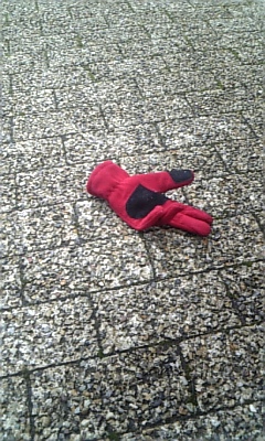道端に落ちてた手袋っ!!この指の形は意図的なのか、それとも自然の悪戯か(笑誘われるかのように、写メってますた(笑この手袋との出会いが、今日1番の幸せになりませんように(笑あと、ジョジョのこの吉良吉影のシーン使ったら相当キモい日記になるな(笑